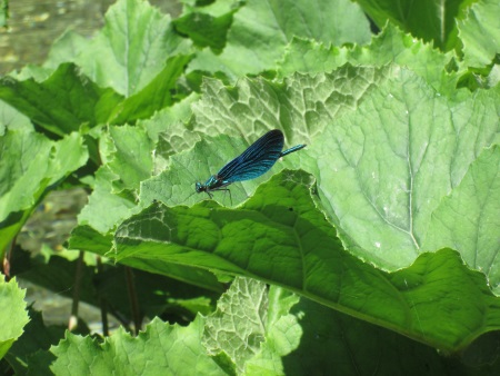 | 昨天天陰,山色有點灰朦朦,今天便截然不同了,陽光為湖光山色添上神采。走到一處大瀑布,一座突出的圓形岩山灑下晶瑩的水柱,就像吸飽水的巨型海綿,蔚為奇觀。在上湖區經常發現一種通體藍綠色的青蜓,我想它們就只為這裏的美景存在吧? |