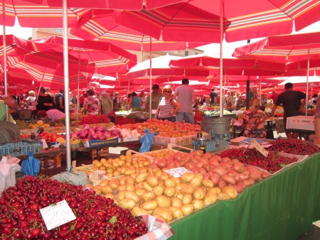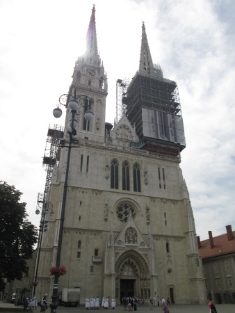 早上收拾行裝之際突然停電!冷氣關掉,燈也熄了,外面的用餐間也一樣。不久後 Tanja 回來為我們準備早餐,雖不能煮食,但簡單的火腿、芝士、麵包已很美味。 薩格勒布的景點非常集中,一般來說只需半天便可遊遍舊城區。從旅店出發,大約十分鐘便可抵達擁有一雙尖塔的聖母升天大教堂。正門上方和兩邊均刻有許多精緻的雕像,裏面樓底特高,彩色玻璃窗也很壯觀。教堂旁邊是屹立了幾百年的城牆和圓塔,也有廣場和草地,可在樹下享受悠閒時光。在鄰近的超市買支飲品,已經是 Dolac Market 的範圍。市集中央擺賣果菜,一大片紅色傘子遮擋太陽,正熱鬧呢。旁邊有家品、紀念品、芝士等檔攤,角落處還有魚市場。