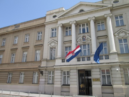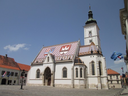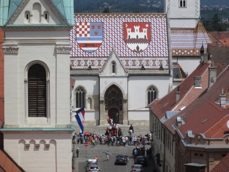 | 續走一兩分鐘,一座有彩色瓦頂的教堂立於廣場中央,那便是聖馬可教堂。彩色瓦頂拼成的圖案是薩格勒布及鄰近地區的盾形紋章,使建築物格外搶眼,成為城市的象徵。這個廣場左邊是總統府,右邊是國會,因此是克羅地亞政府的中樞。此時行人稀疏,靜悄悄的。烈日難當,只好提早返回旅店,還麻煩了 Tanja 回來開門讓我們取回行李,真不好意思!