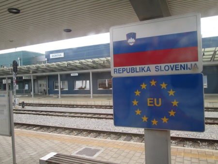 薩格勒布火車站月台偌大,旅客卻不多。此時正有小學生排成一行,由老師帶領着走過。十二時半,我們乘坐的火車在風雨中駛進月台。登上車廂,佔據了一個六座位包廂,環境倒也整齊清潔。火車在半小時後抵達克羅地亞和斯洛文尼亞的邊境車站,月台上的歐盟標誌代表我們進入歐元區了。穿着制服的人員上車檢查護照,對我們那本好像很好奇,看了又看,最後蓋印離開。列車在這個車站停了約半小時才繼續開行,看着窗外景物,很容易覺察到斯洛文尼亞較為富庶:鐵路和道路設施比較完善,房屋外觀也光鮮亮麗,這可是一條看得見的國界呢。