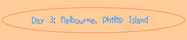 | 於海濱的 Dockland 地區吃過中式午餐,便乘車離開市區前往東南方的菲利普島 (Phillip Island)。公路旁常見大片大片的草地,牛羊漫步吃草,正是心目中澳洲的典型景觀。車行約兩小時,抵達菲利普島之後首先參觀朱古力工廠,再到度假村分配今晚留宿的小屋。度假村位處自然保護區內,我們每兩個人入住一間度假小屋,廚廁、睡房、客廳設備齊全,更有戶外桌椅讓住客享受大自然。如此獨特的住宿使大家都非常雀躍。 |