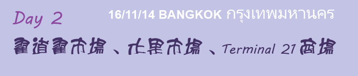 今天我們八時許便到酒店餐廳吃早餐,碰見來自不同國家的西方遊客,日本人也有不少。餐廳環境舒適,服務亦佳。雖然酒店的商場和房間令人失望,但食物方面為它挽回不少分數。自助早餐因應各國來客的口味,選擇十分多。有基本的麵包、沙律、粟米片、香腸煙肉等等,有日本遊客喜愛的麵豉湯和壽司,也有專人即場炒蛋、煎蛋,甚至有羊排和「Hong Kong Congee」!雖然只可選擇皮蛋、豬肉和魚片放在粥內,也足見誠意。值得一提的是水果,香蕉和木瓜都很新鮮香甜,石榴汁亦不可不試。 經 BTS 轉乘地鐵,乘客比較少,甚至可以找到座位,或者是途經的地區沒那麼繁忙吧?在 Kamphaeng Phet 站一出便是翟道翟周末市場,不過我們去錯出口,要經行人天橋過馬路才能進入市場。翟道翟市場佔地非常大,場內有幾條可通車輛的道路比較闊,但要逛市場的小店就必須深入四通八達的有蓋巷道。雖然這一萬多個檔攤花一整天也沒有可能走完,但它們亦有按貨品種類分區,大可選定目標和行走路線。我們首先進入的是舊書區和衣料區,行經幾間店鋪售賣色彩繽紛的木牌,上有「Kitchen」、「Open」等等字樣,也可揀選卡通公仔作裝飾,並有相關材料和配件出售,可以完全 DIY。 我們跟着在服裝店間穿梭,每條巷都似無盡頭,想逐個檔攤細看簡直不可能,亦無必要,因為貨品多少有重複。T 恤、手袋、飾物琳瑯滿目,有些價錢便宜得不好意思討價還價。況且店主多半不肯減價太多,所以還是適可而止。印花 T 恤和球衣多為仿冒品或者沒有品牌,要買的話還是多留意質素吧。