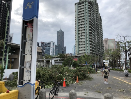 | 稍息之後便下樓找吃的,對面馬路便有間「老江紅茶」,點了紅茶牛奶,還有我喜歡的蛋餅。高雄市面行人不多,氣氛遠較台北悠閒。我之後坐捷運到台鋁商場,那邊的塌樹更多了,也看見不少招牌被吹倒,行人路上有許多破碎的鐵皮和膠片。台鋁商場的書店不大,今天更顯冷清,於是轉移地點,搭乘輕軌到高雄流行音樂中心。