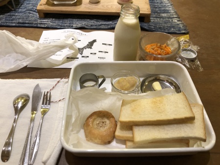 | 房間外面是個很大的廚房空間,中央放置長桌。我在雪櫃找到自己那份早餐,在長桌上進食。方形瓷器餐盒內有方包、鬆餅、西瓜乳酪、百香果果醬和無糖豆漿,顯得精緻用心。用餐空間也有家居的感覺。